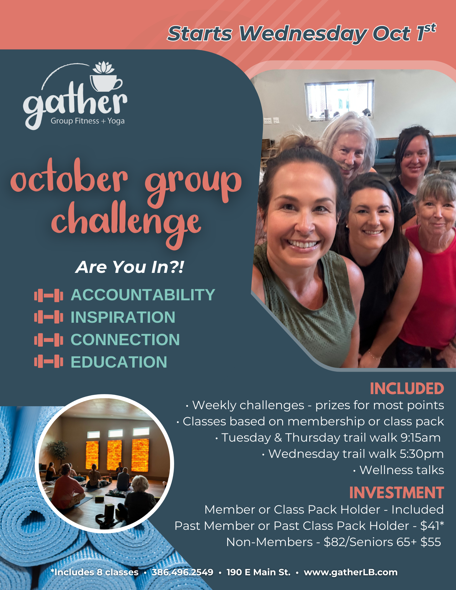 We’re inviting you to pause, reset and prioritize yourself during October with our Group Challenge! This month isn’t about perfection, it’s about showing up, staying connected and making small choices that fuel us mind, body and soul. And maybe win some prizes on top of it!
